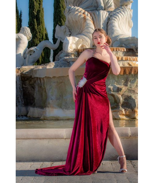 Vestido de terciopelo elástico con cola lateral, ideal para posados